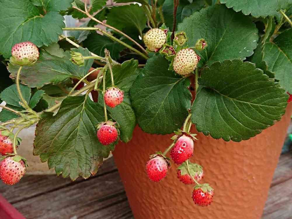 赤い花が咲くいちご、ローズベリーレッド。暑い時期を除いた秋まで収穫できる、となってますが、この暑いのにまだ実がなってます。