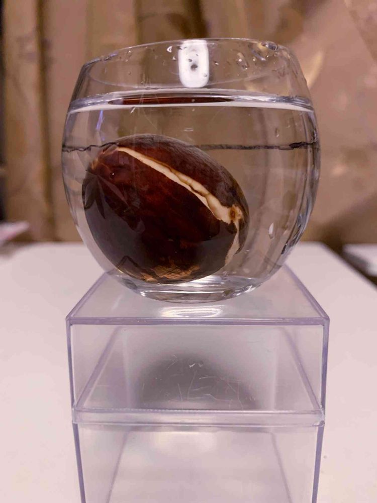 で、トイレのタンクの水が出るところに、浅めの皿に玉砂利と植物など入れたところがあったので、そこに、種の下部分が浸かるように置いておいたら…いつの間にか割れて芽が出ました😆