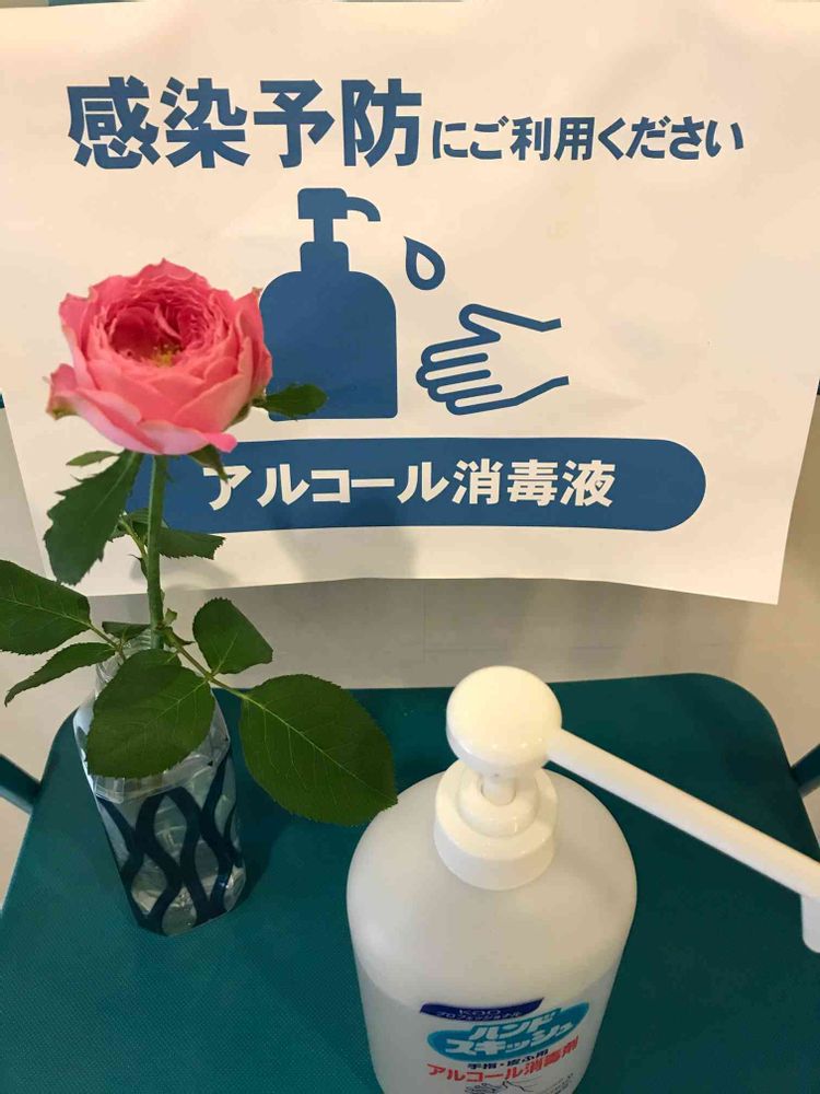 嬉しさのお裾分け、と思いマンションエレベーター横の消毒液コーナーに飾らせて頂きました。