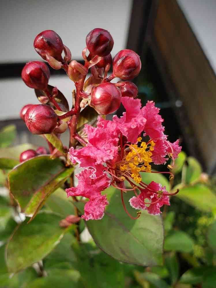 こちらのサルスベリ(ペパーミントレース夏祭り)は矮性種ですので我が家では、ベランダで鉢栽培しています。一才性で、小さいうちからよく咲いてくれます。お尋ねの件、バックはお隣のお家の壁が写りこんでいます、狭いベランダに鉢を和洋問わず賑やかに放置しております😣😭。これからもどうぞよろしくお願いします。