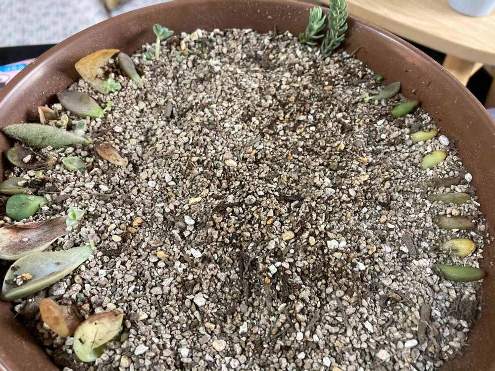 まだ大丈夫そうな子達を並べ直したのですが…あの見事だった虹の玉&オーロラの葉挿し畑がスッカスカ…ぴえん😭