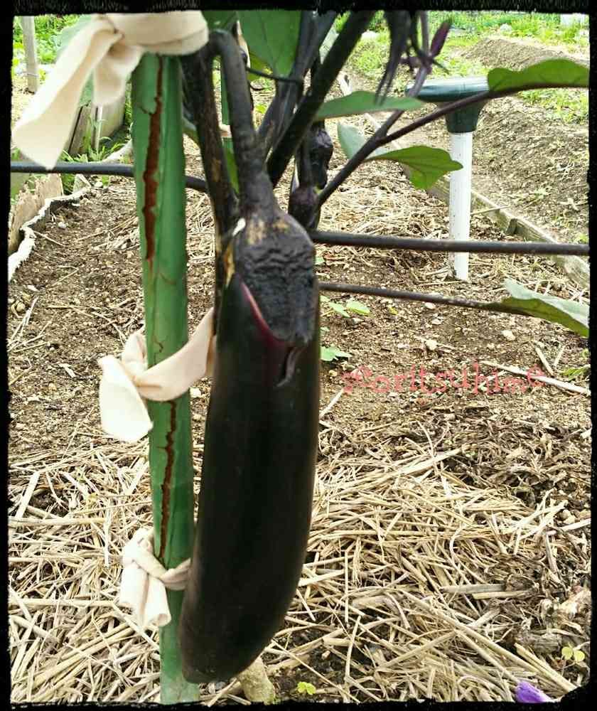 普通のおナスの中長ナスが大体15㌢くらいで収穫するからかなり大きめのおナスです。