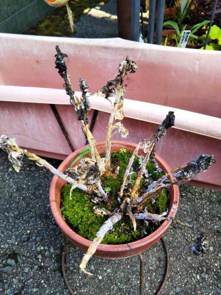 咲く花楽しみにしてました、「⁉️」春にさつき師匠から頂き、順調に成長してたのに、アブラムシ大量発生😰😓😭薬剤スプレー遅すぎ(やり過ぎ)ました。👴👀毎日見て会話してたのに残念、朝師匠にお詫びのラインしました。追伸❗️ラインで師匠から連絡、上部分を切り取り処分下部は生きてました。