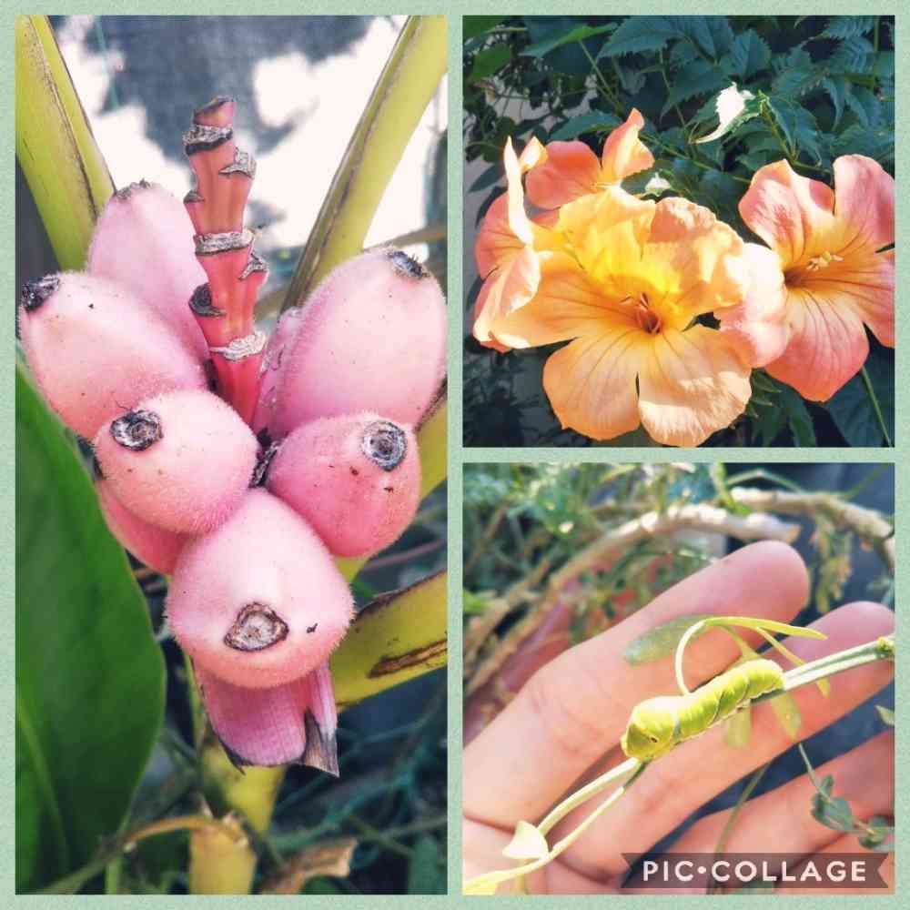 朝🍌とノウゼンカズラ、ヘンルーダについてるアゲハチョウの芋
