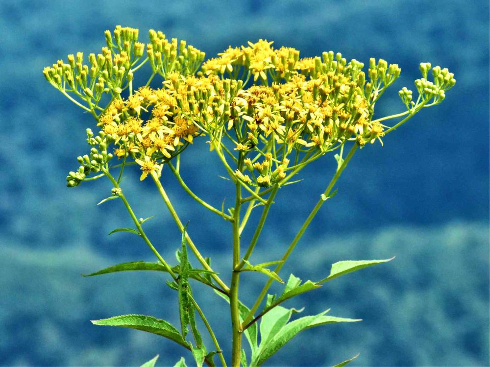 山並みを背景にしていた、ハンゴンソウ(反魂草)の花序を望遠で。