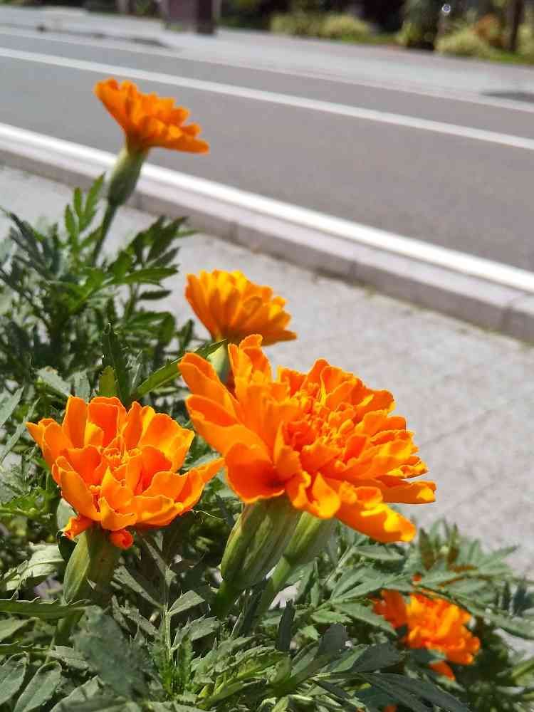 道路脇の花壇にて。マリーゴールドは酷暑にも負けず咲いています。