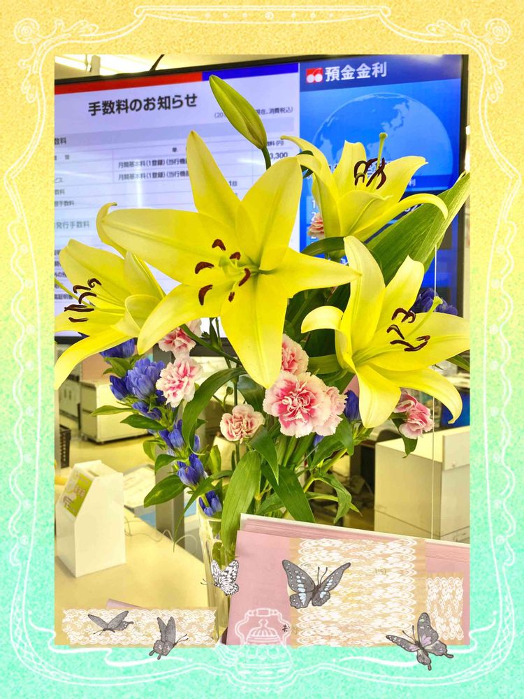 🍒Y銀行に飾られたツボミだった百合の花色は~薄い黄色でした🤗