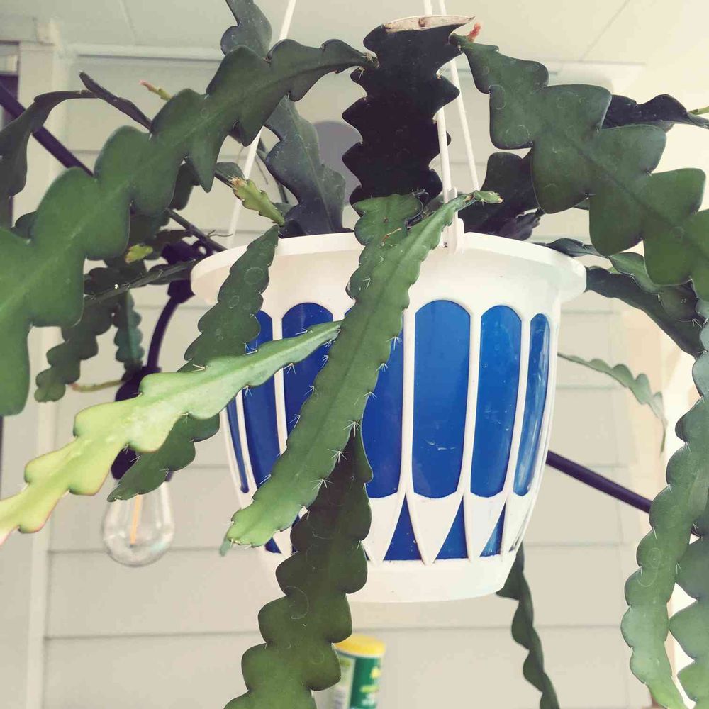 ギザギザフィッシュボーンカクタス、青のラインの入った吊りプランターが夏っぽい💕