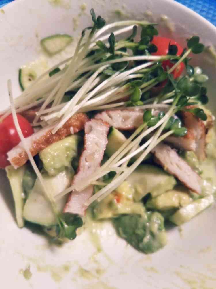 お買い得品の🥑に処分品のズッキーニと島オクラとカイワレ、プチトマト🍅に練り物でパワーサラダ的な。