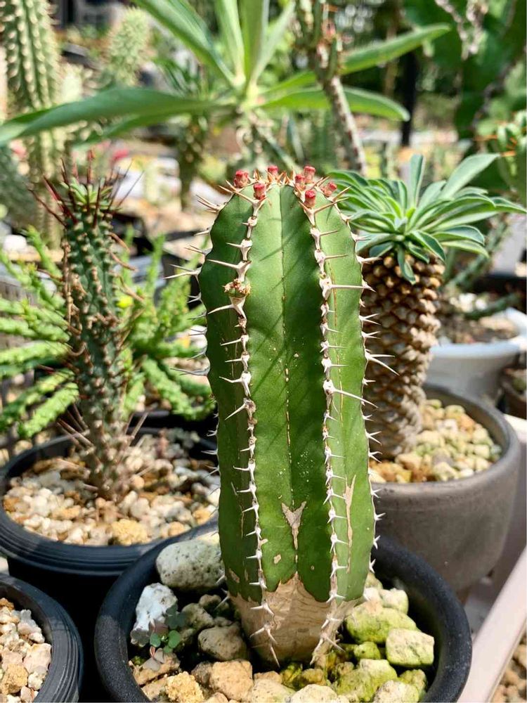 「実はこれはサボテンではないんです。サボテンにはトゲの根本に座布団のような刺座があるのですが、これにはありませんからねぇ。これはユーフォルビアというグループで、雑草のトウダイグサの親類なんですよ。ああ、細かいことが気にかかる。ボクの悪いクセ😆」by 杉下ねこ右京