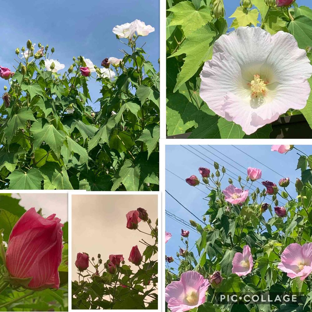 どんなに暑くても、真夏の青空に向かって咲く酔芙蓉のお花♪̊̈♪̆̈