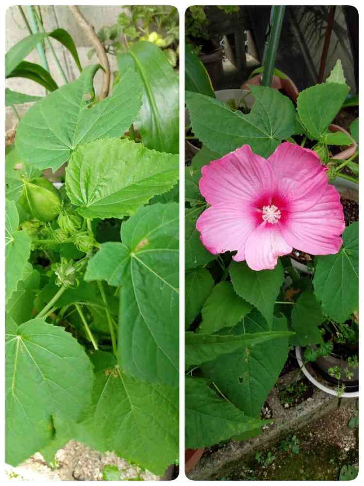 花友さんがくれた小さな苗…蕾が開きました😃!アメリカ芙蓉でしょうか?花びらが虫に食べられた!😓