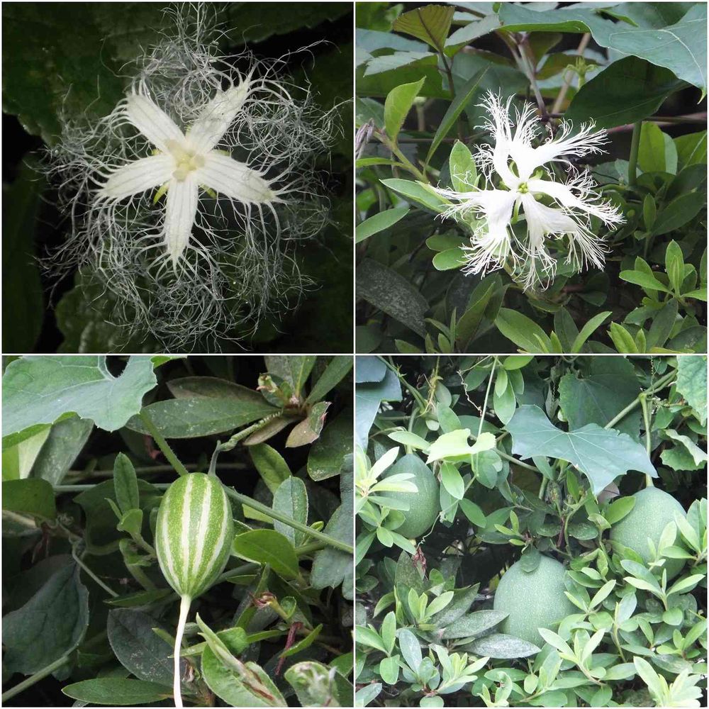 左上を除き、同一日時、場所のpicです。左上は以前投稿した「カラスウリ」のpicです。「キカラスウリ」は花弁の先端が2つに分かれているのが解ります。😃