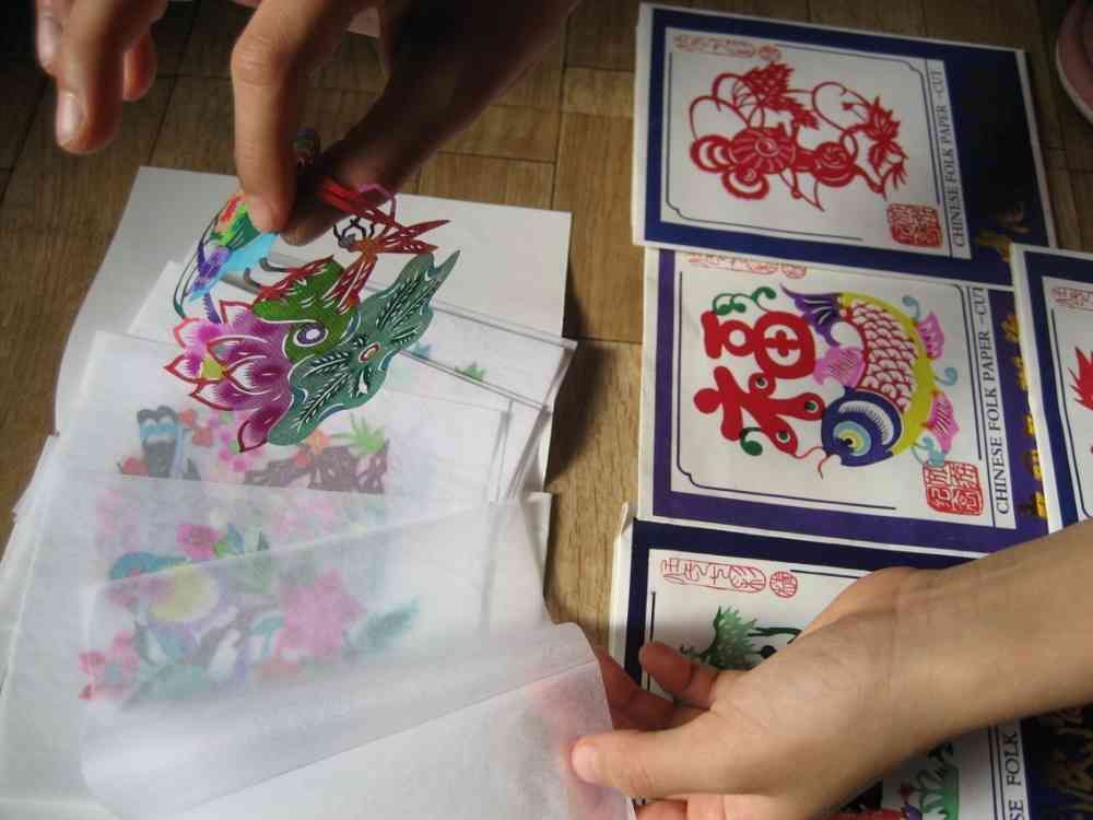 「剪紙せんし」とは中国の繊細な切り絵のこと。触ってみるとティッシュの1枚を半分にはがした1枚で、切り絵を作ってある。これを子どもが触るのは、命懸け