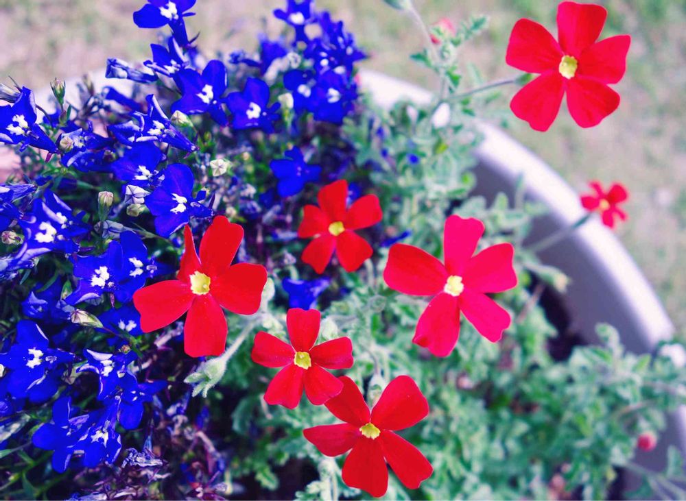 スカーレットの赤い花リベンジで買い直してようやく見頃に。紫のは何処かのおじいさんがお祭りで出してた100円で買ったやつ。赤と紫のコントラスト好きで寄せ植えに。