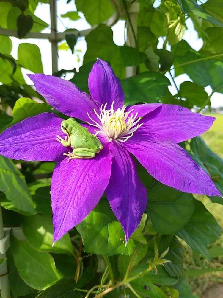 クレマチスのパープル色💜がきれいですね😍✨そこにいるカエル君🐸の可愛さも好き💓
