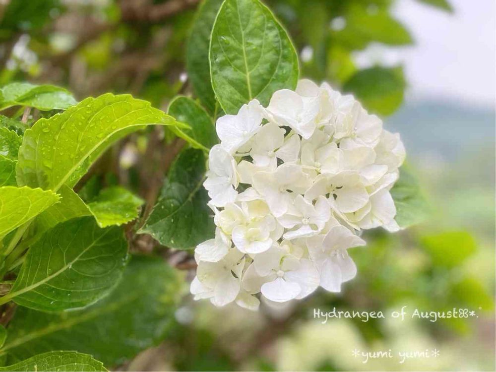 白い紫陽花さん かくれんぼしてても 見つけてもらえて 雨でキラキラしながら喜んでますね*♬೨̣̥