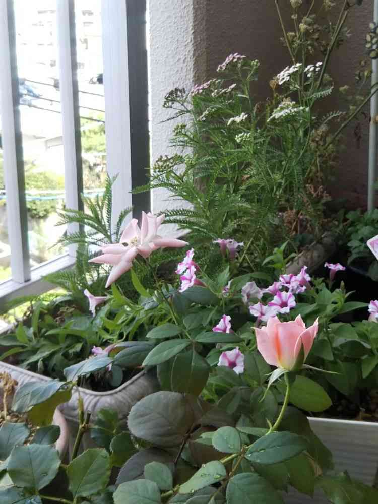 ベランダ隅の 鉢たち。挿し木の 薔薇 優花が ほんのりピンクで かわいい❤️