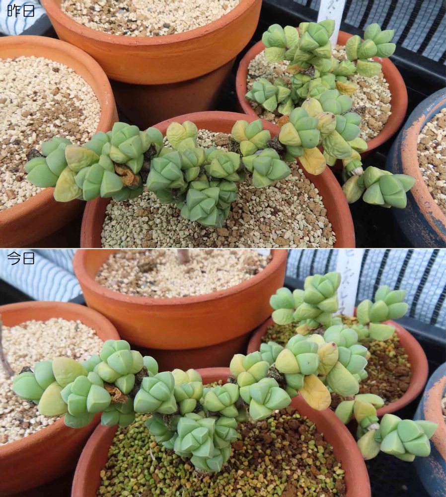 お盆を過ぎても一向に涼しくならない上に,ほとんどの多肉は水を断って1か月くらい経つため,昨日意を決して一斉に水やりを決行。今日見ると,痩せたりしわしわだったのが一晩で劇的に復活しているのがいくつかあった。
