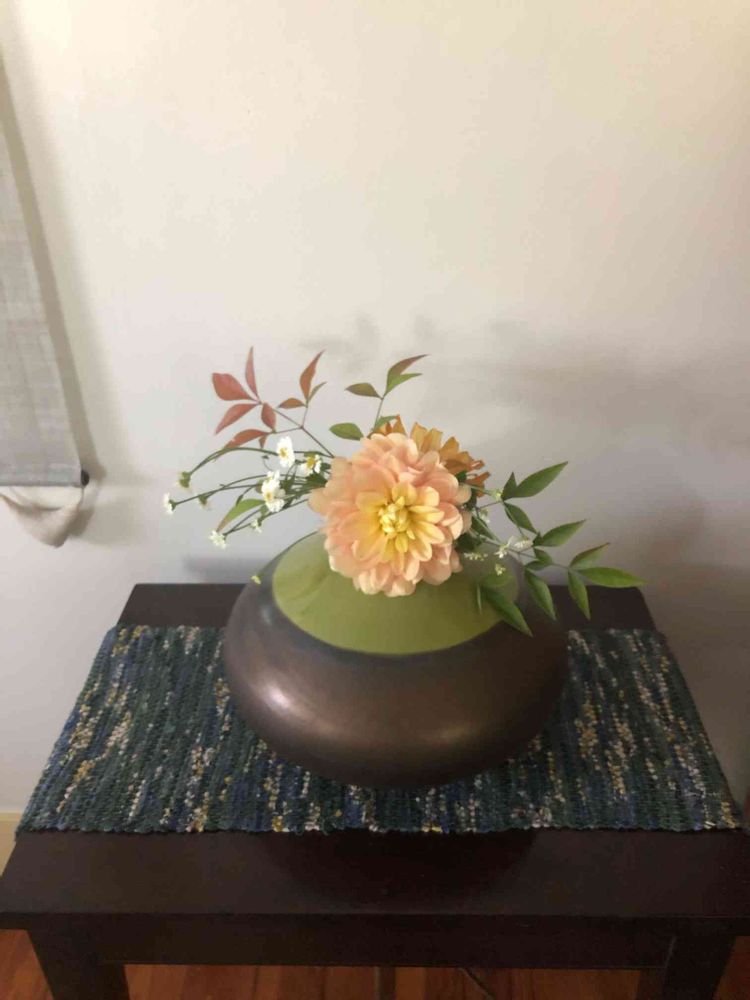 先ほどの同じお花器とデザインで花の色を変えると全体がどう変わるのかというレッスンです。花材はダリア、ジニア(後ろに入ってます)南天の葉、フィーバーフュー(ナツシロギク)