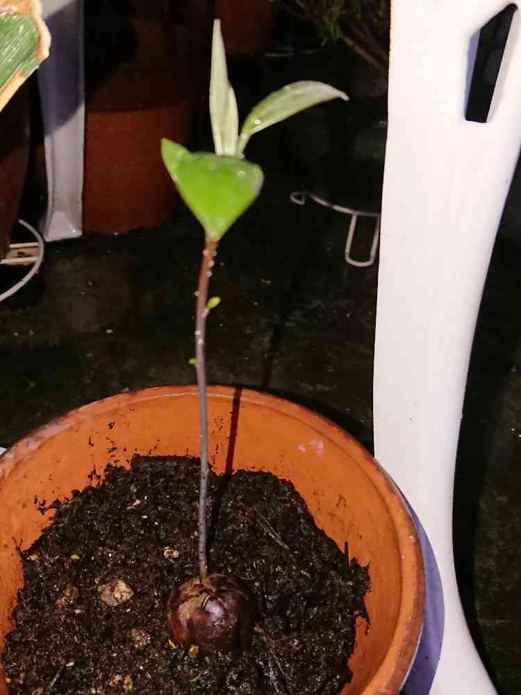 水に漬けて、2ケ月位かかって、やっと根が出て少し芽のような、上に一本ヒョロッとした物が出たので、そのまま土に🥑の半分位を出して植えて見ました🍃