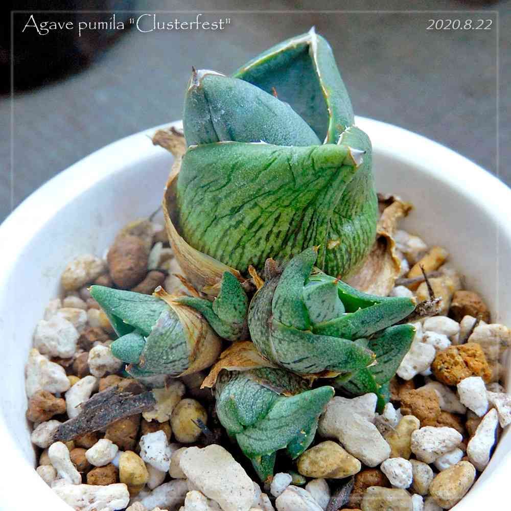 アガベ、プミラ・クラスターフェスト。株が小さい状態で成熟してどんどん子吹きして増えるタイプらしい。まだやってきたばかりでしなび気味。早く水を吸ってぷっくりコロコロしてほしい。