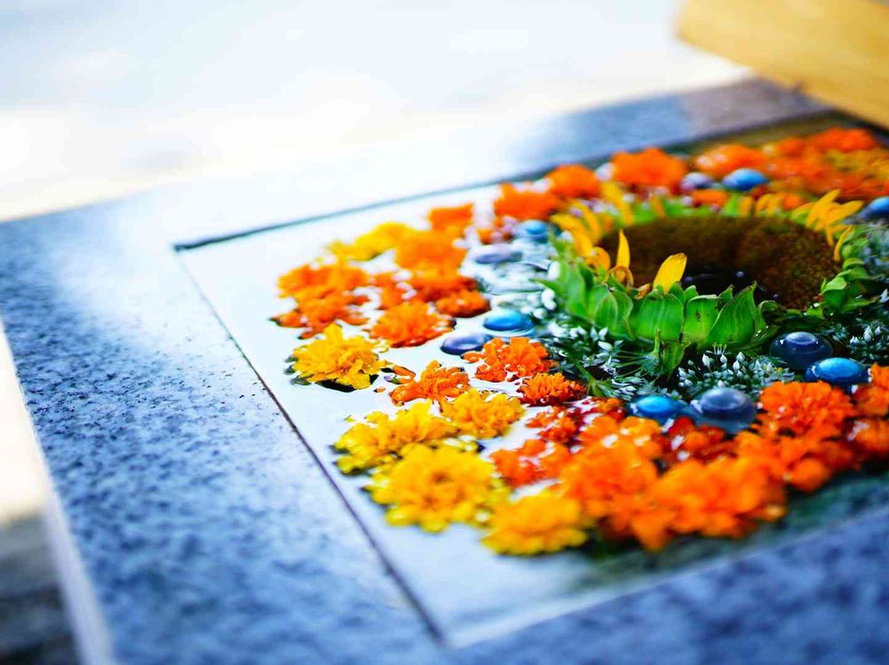 ひまわりやマリーゴールドがたくさん浮いていて、とても涼しげで素敵でした。