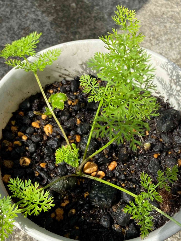 7/22 投稿しましたキッチンで発根した再生キャロットさんを土に植え付けたもの。