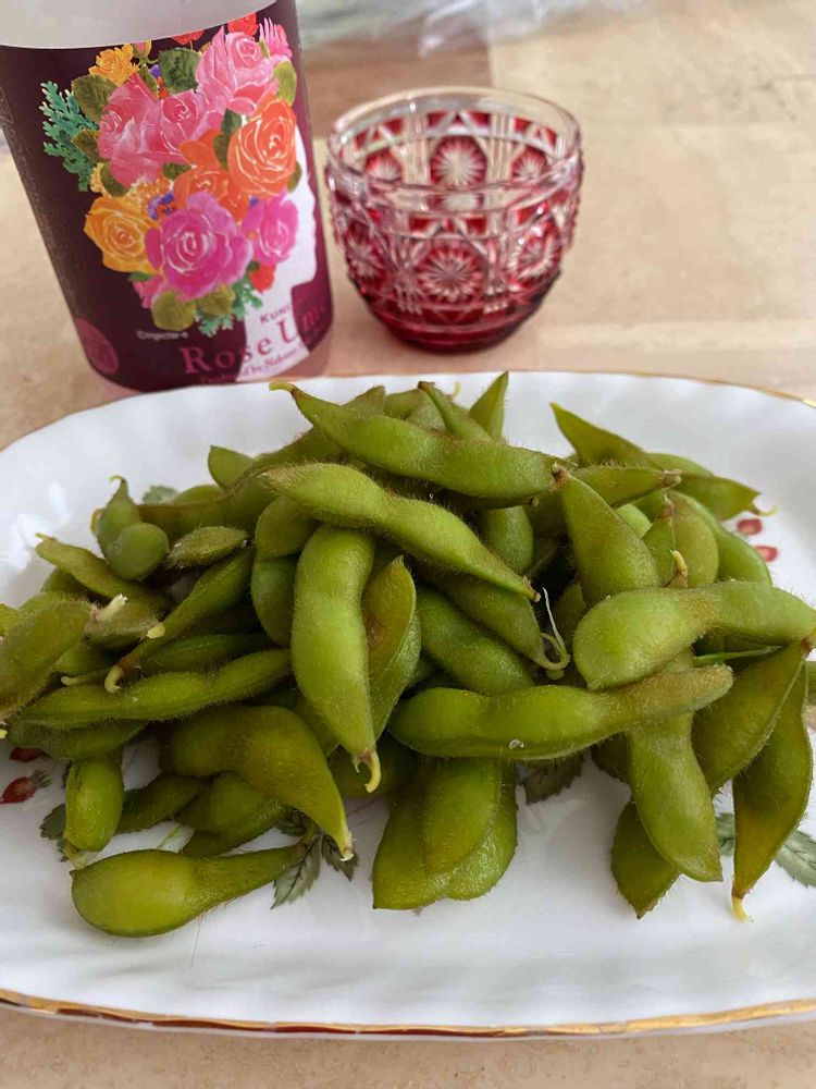 枝豆収穫祭行いました😋とりあえずビール🍺がなかったのでここはお花のローズ梅酒🌹で乾杯🥂