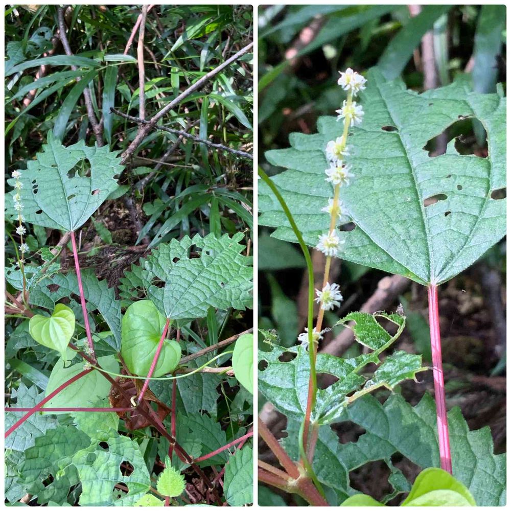 葉は対生、菱形、上2辺のみに鋸歯、葉脈が複雑。(ほとんどの葉が虫に食べられて穴あき💦)