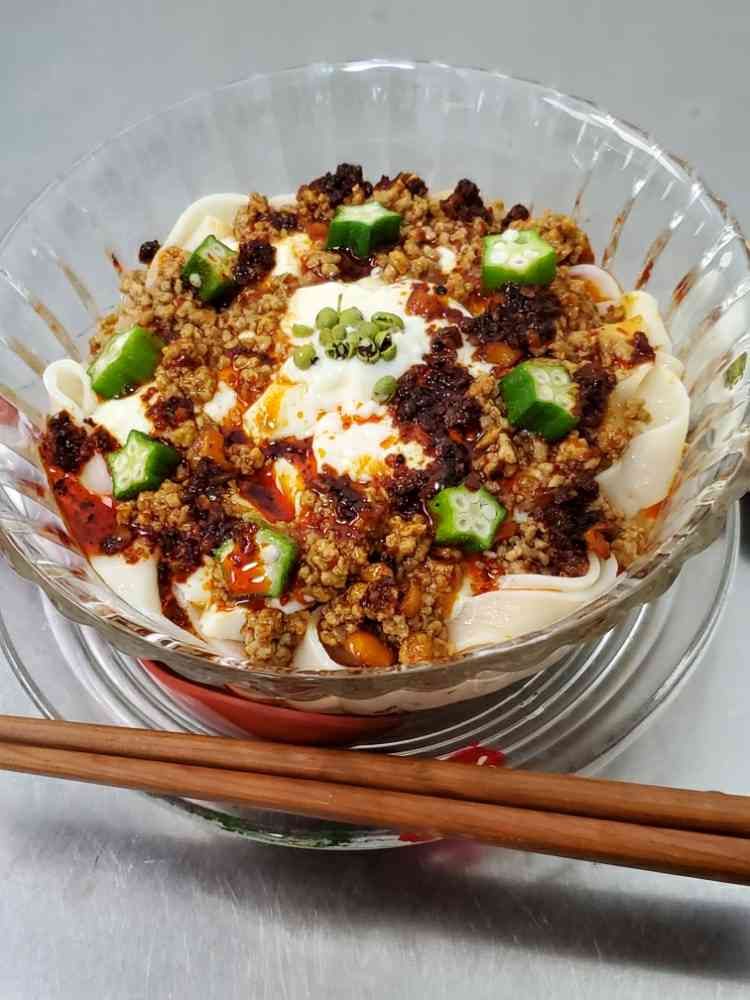 オクラ入りの『冷たい麻婆豆腐混ぜ麺』今の時期的に最高なレシピです!有難うございます。