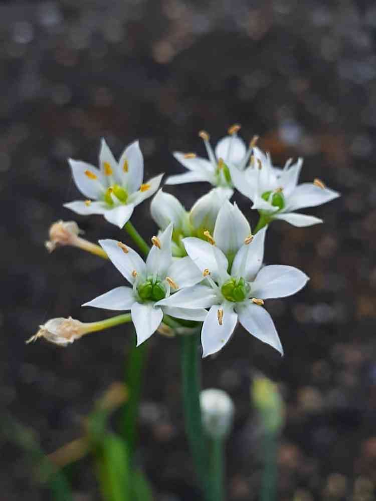 葉の間から伸びた花茎の先端に、半球形の散花花序をつけ、白い小さな花を20 - 40個も咲かせる