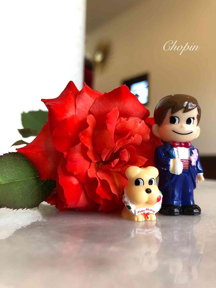 真っ赤なバラ🌹の横でペコちゃんを待つポコちゃん…⛪️