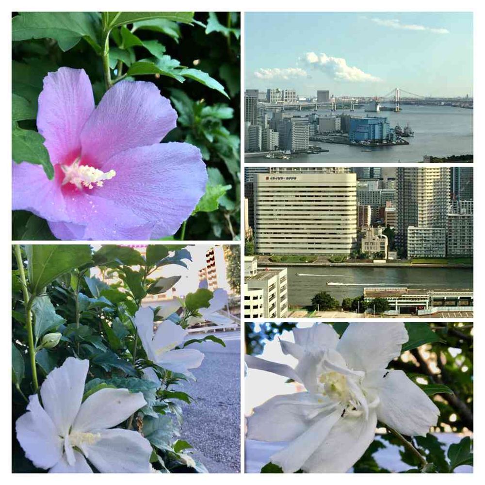レインボーブリッジ❓に、都会のビル🏙、そして心和む木槿のお花の数々🌸🌼