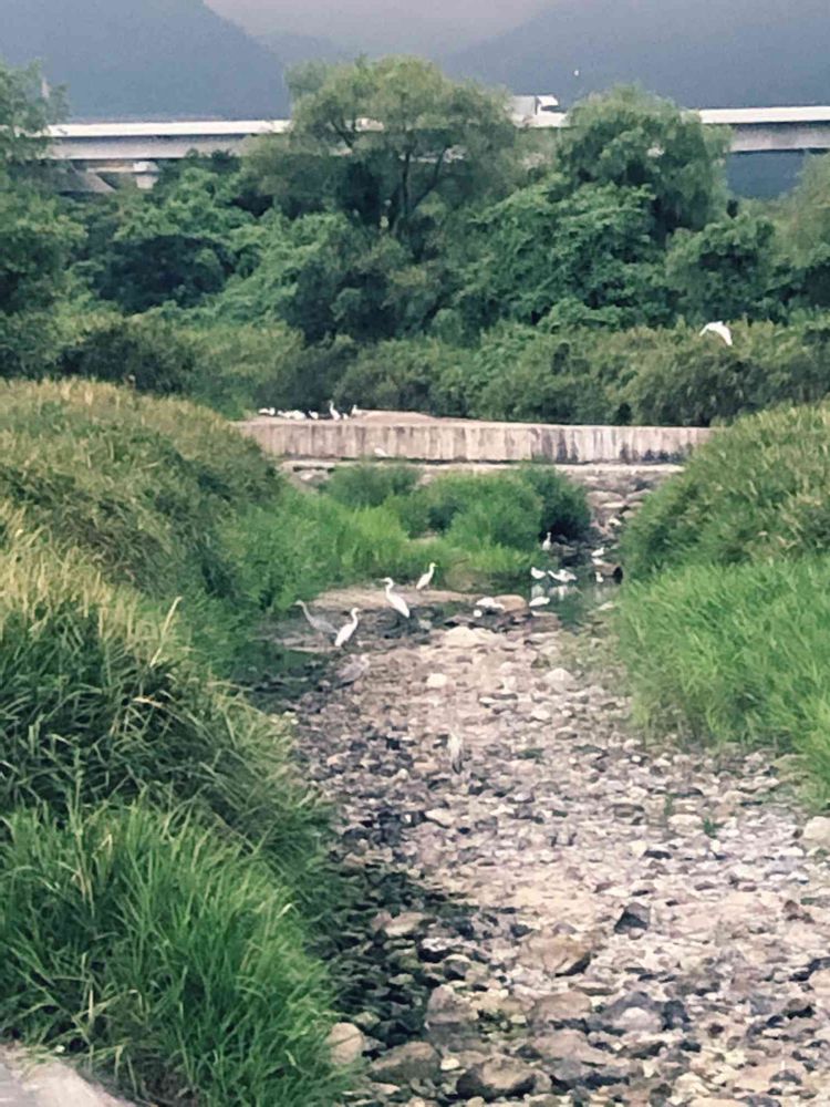 扇状地の伏流水の川なので大雨が降らない限りチョロチョロしか流れない。そんな川に渡りの鷺鳥が水をもとめてやってきてます!