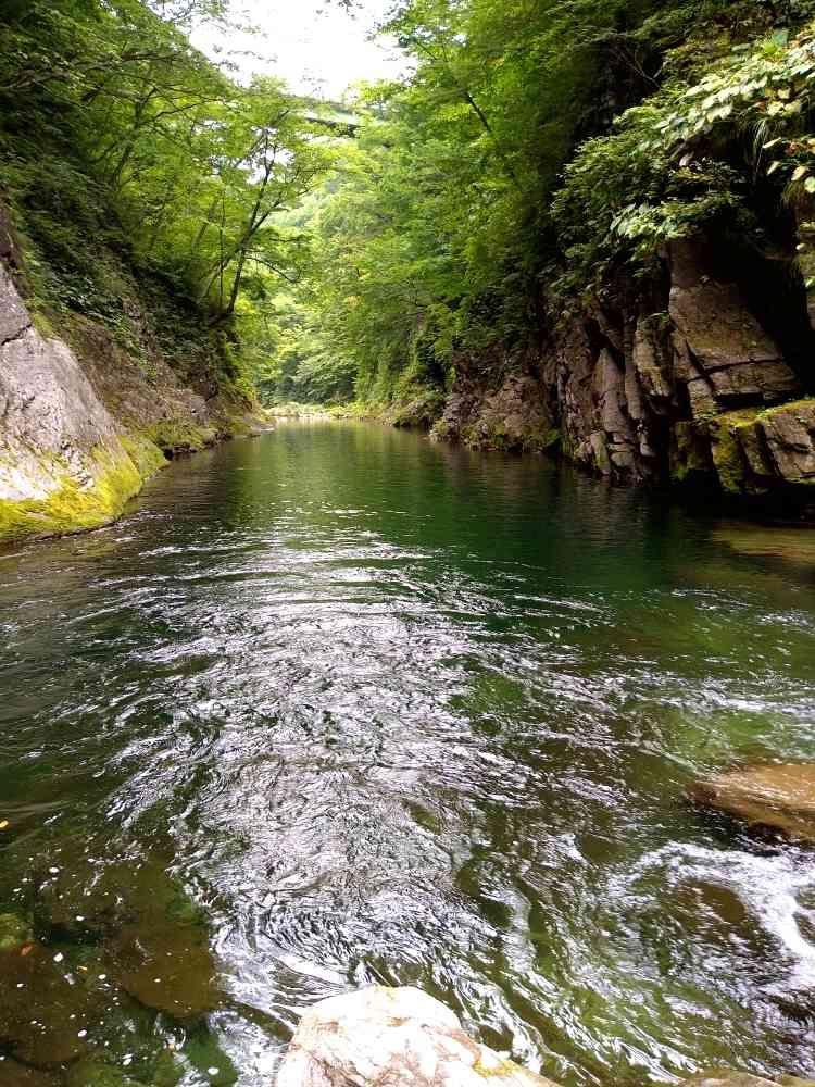 秋保大滝の滝つぼから続く川は、すぐに深くなり、周りの木々も反映して、滝の水しぶきの白さとは対称的な緑色になっています。