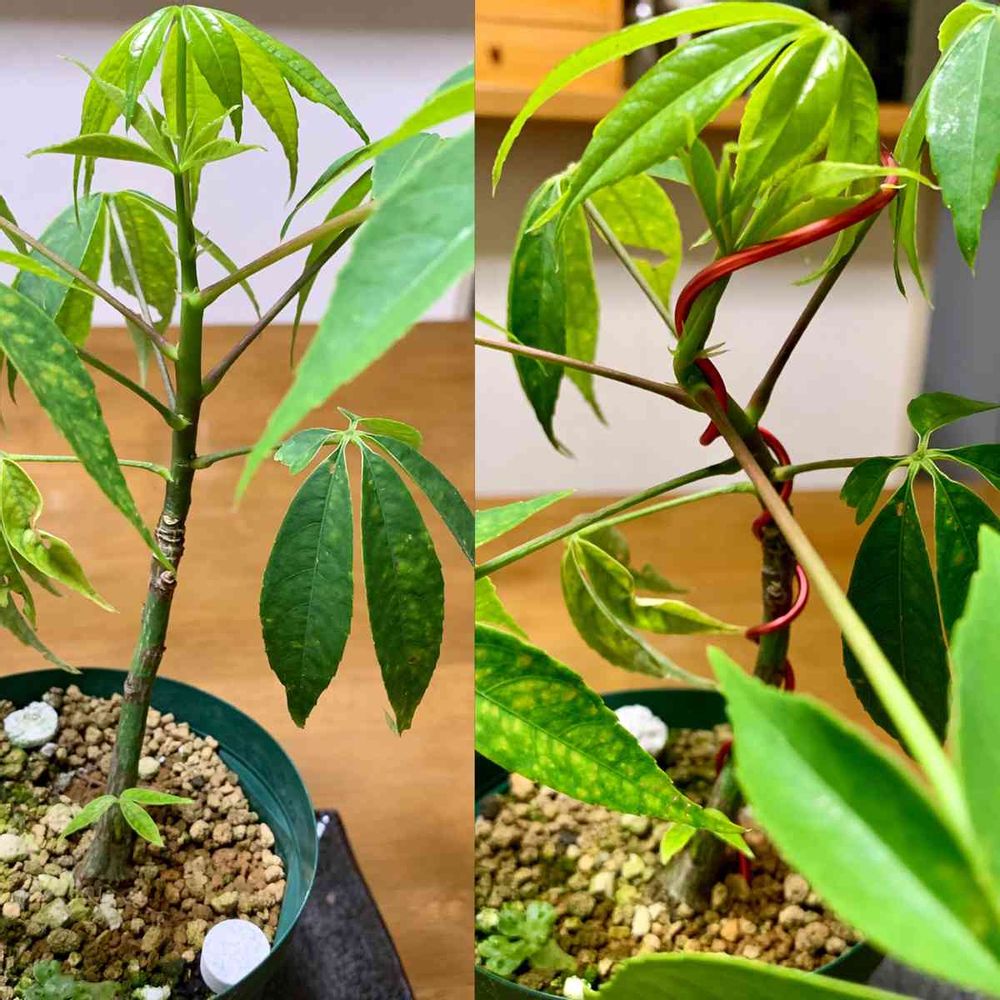 ➡️これを模様木に育てるべく、まだ柔らかい苗木のうちに針金を掛けて軽く曲を付けてみます。