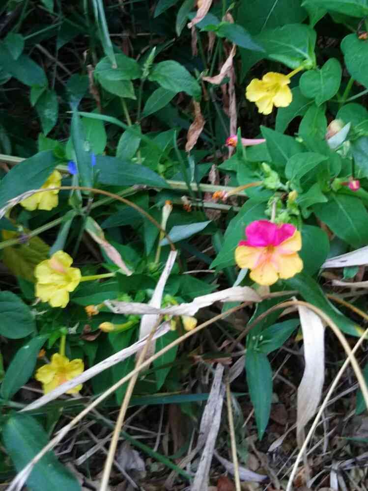 🌼おしろい花 🌱 ピンクとイエローの合わさり具合いが絶妙✨ 葉陰には露草が ひっそり💚