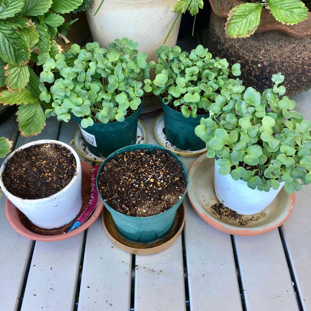 前左と中央鉢は、昨日紫カイワレ大根を種まきしました。