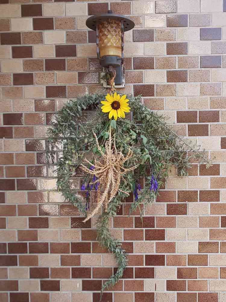 パープルさんのエントランス,ひまわりの花・ミモザ・ハーブ・とうもろこし穂先のスワッグ,スワッグの投稿画像