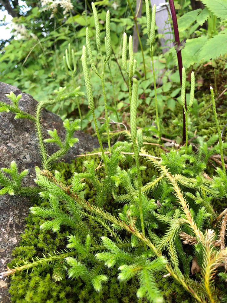 小さな苔に覆いかぶさるように這っていたヒカゲノカズラと長く伸びた胞子嚢穂🌿