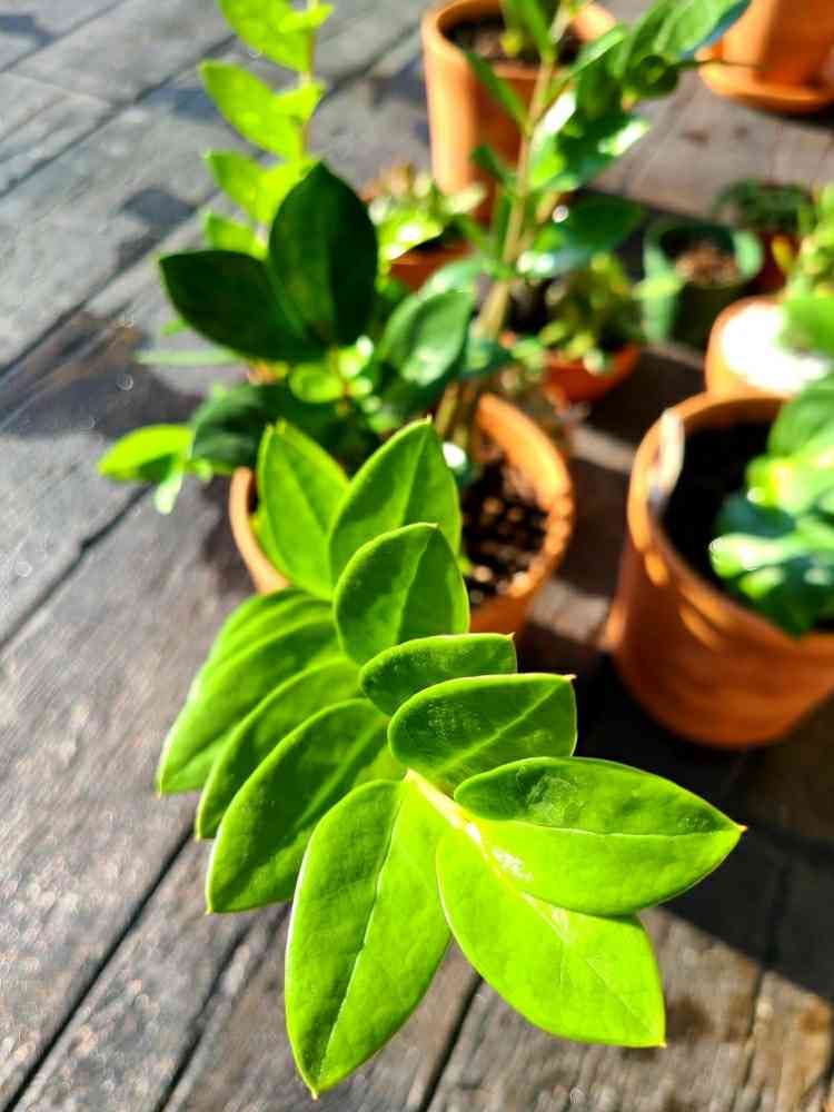 水やり2週間おきくらい(場所•気温で異なる)、まるで造り物のような光沢ある深緑に鮮やか黄緑の新芽🌿