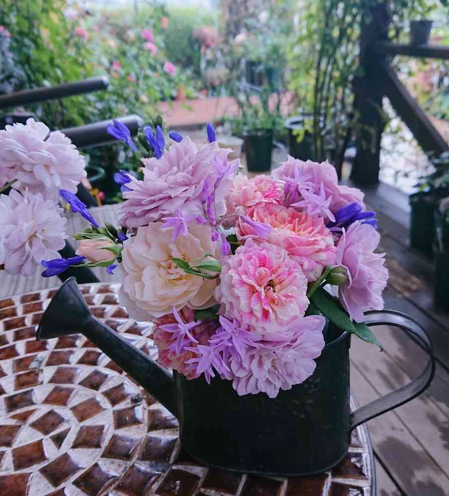 薔薇🌹を切ってテラスで束ねていたら、どしゃ降り☔ しばらくテラスに閉じ籠りでした(^o^;)💦