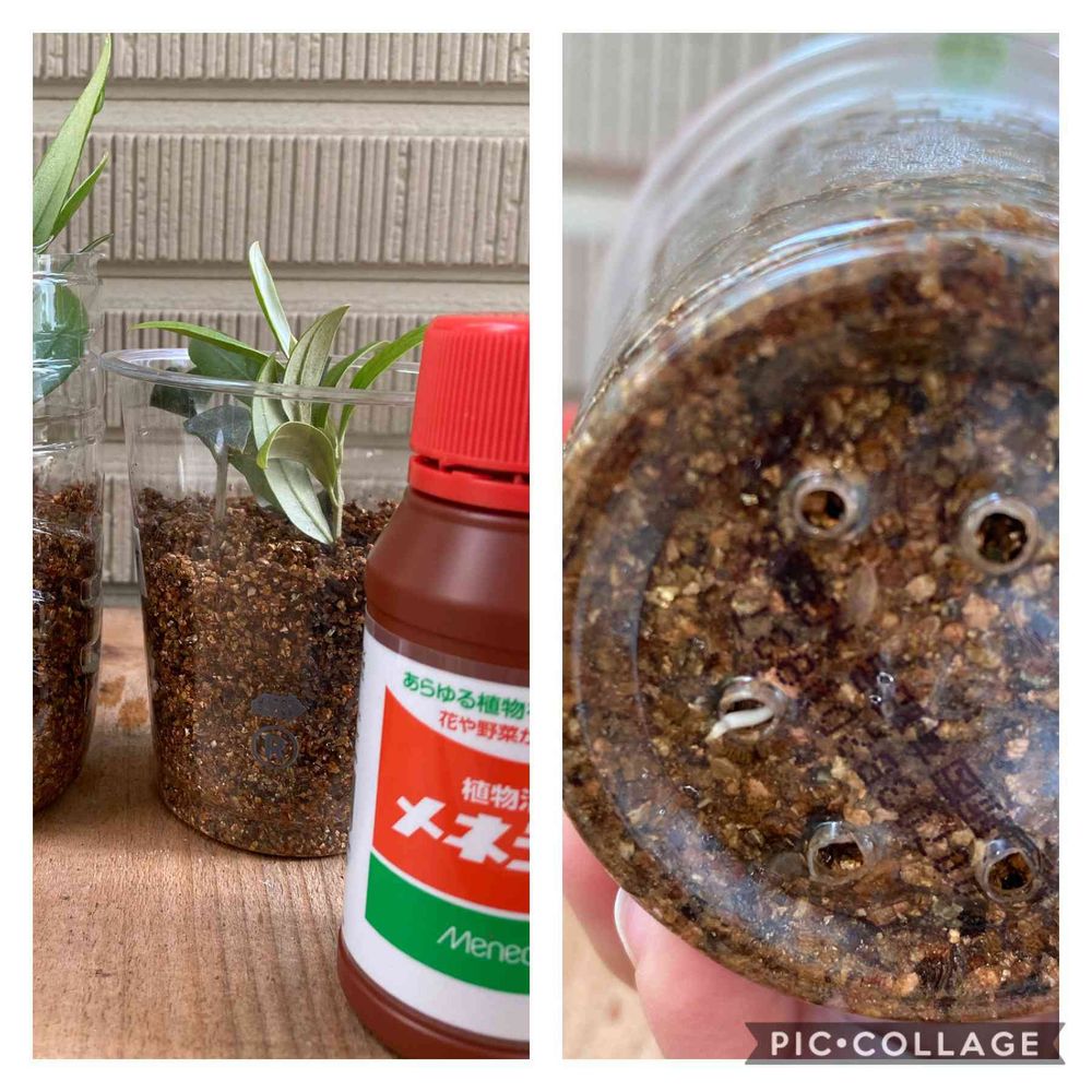 7/21に剪定したオリーブからの挿木、根っこ出てた❣️剪定した方からも新芽が出てたので期待して見た所。うれしいなぁ。