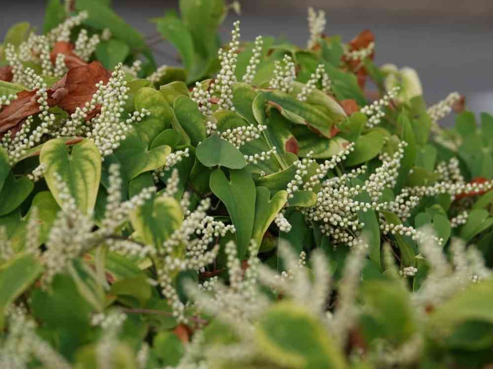 歩道の植え込みに覆い被さるようにヤマノイモが満開!