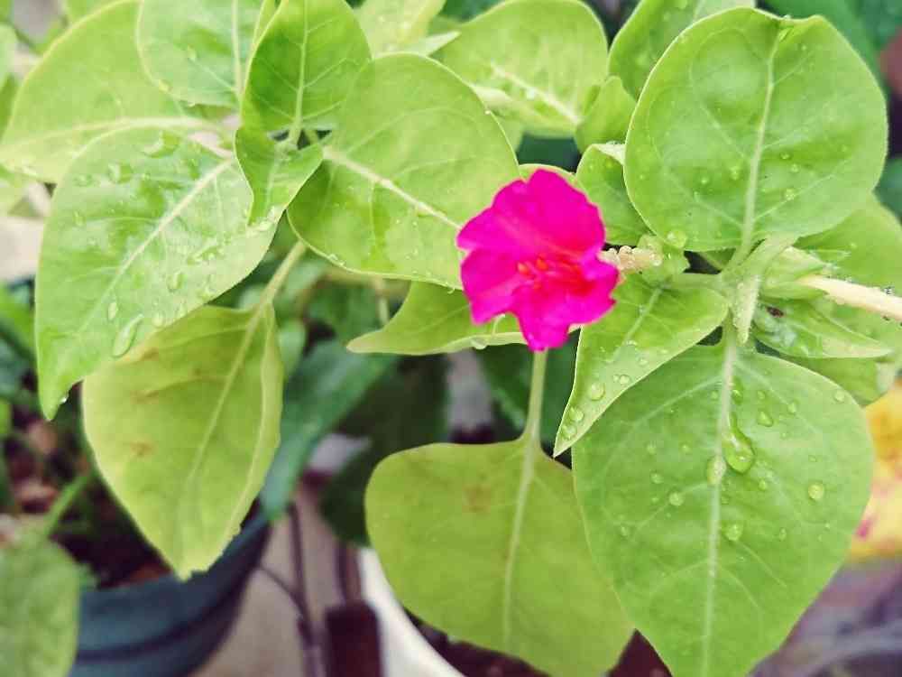 クワズイモの鉢にいつの間にか生えてきたオシロイバナ