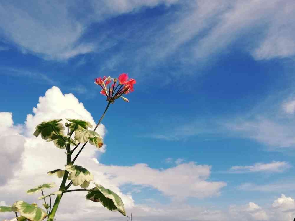 夏の白い雲に、お花さんが吸い込まれそうな青い空 きれいですね💕