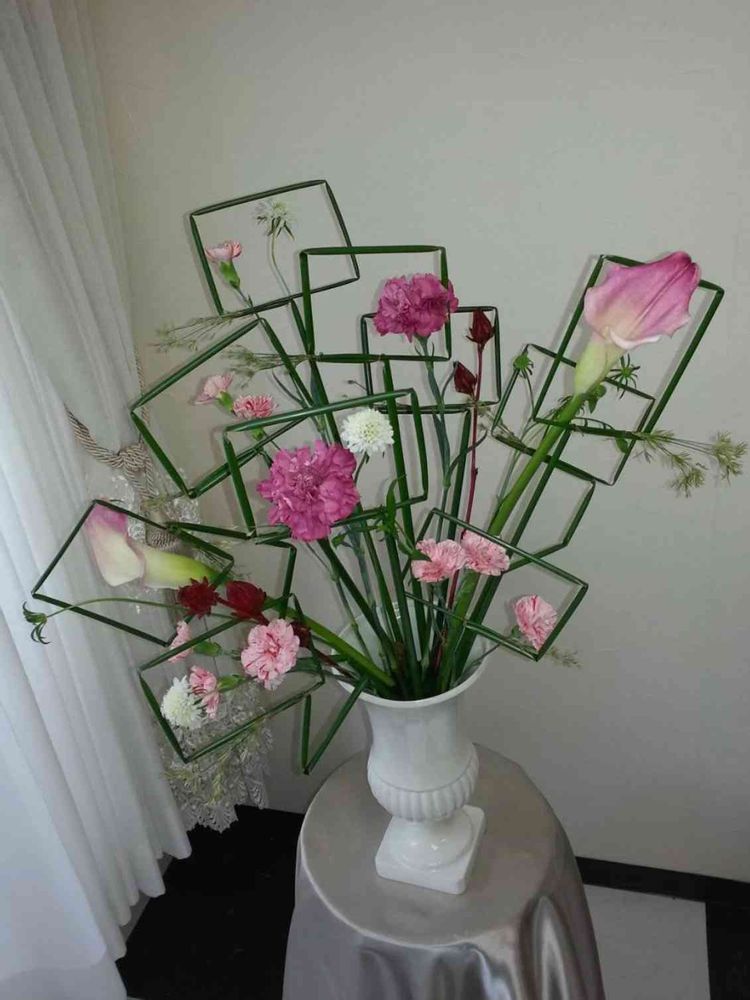 これは…何かの葉っぱをポキポキ…カクカクに?!🤔額の様にお花と合わせて…😶かな?!🤔凄い👏😊👍何か生け花の世界観が…🥰🎶💓素敵ですね👍👏👏👏💓🥰🎶💐