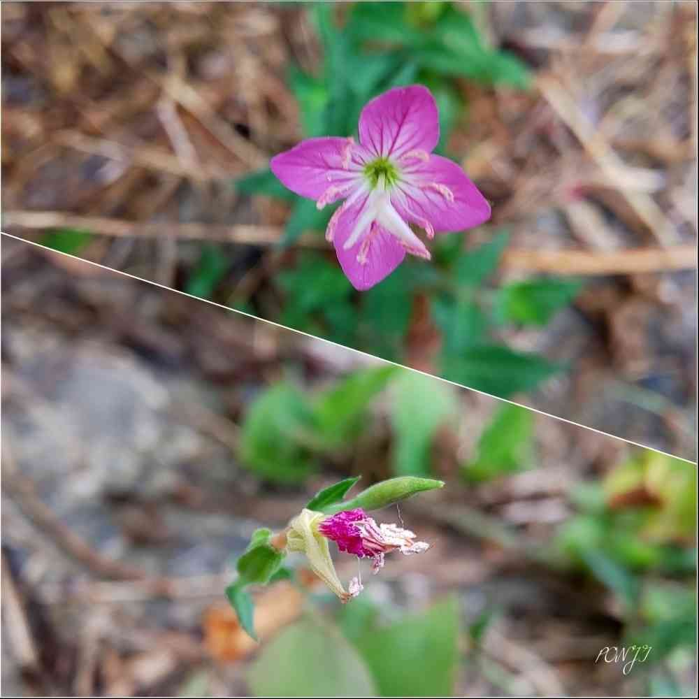 開花中のアカバナユウゲショウ🌸と、蕾かと思って覗き込むと、開いた後に時間が経って、萎んでいました😂🤭