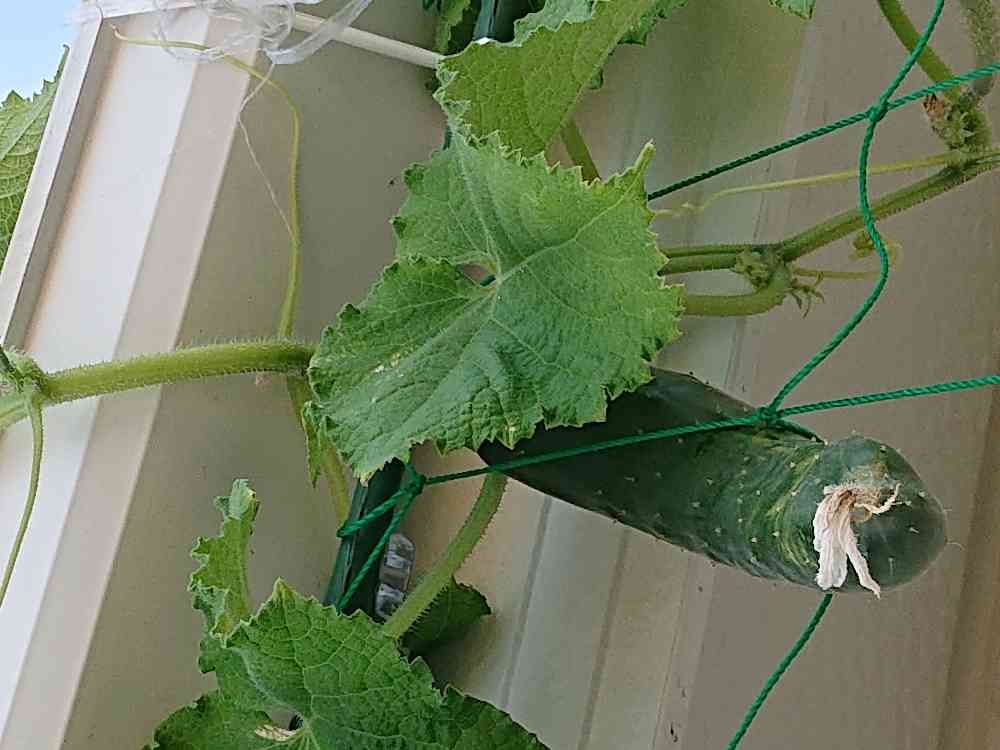 ベランダキュウリ、屋根まで行っちゃった😅さて、取るのがちょっと大変…